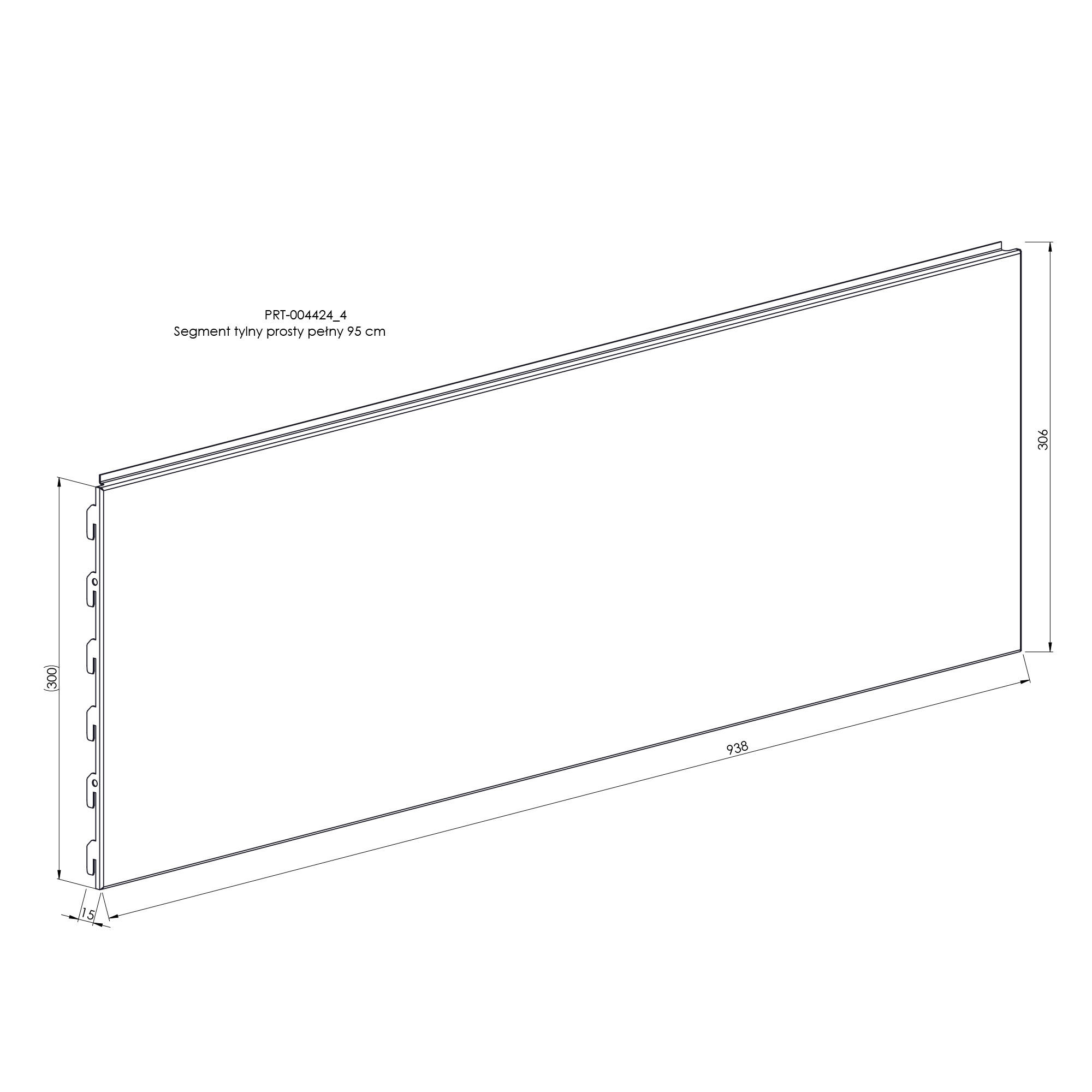 Metalowy element o długości 95 cm, stanowiący plecy regału. Ten typ segmentu wyposażony jest w zaczepy montażowe ustawione pod kątem 90 stopni względem frontu, dzięki czemu pasuje do modułów regałowych ustawionych w linii prostej. Aby zamontować ten element wystarczy wsunąć zaczepy w perforacje słupów pionowych. Segment tylny jest kompatybilny zarówno z regałami naściennymi jak i wolnostojącymi.