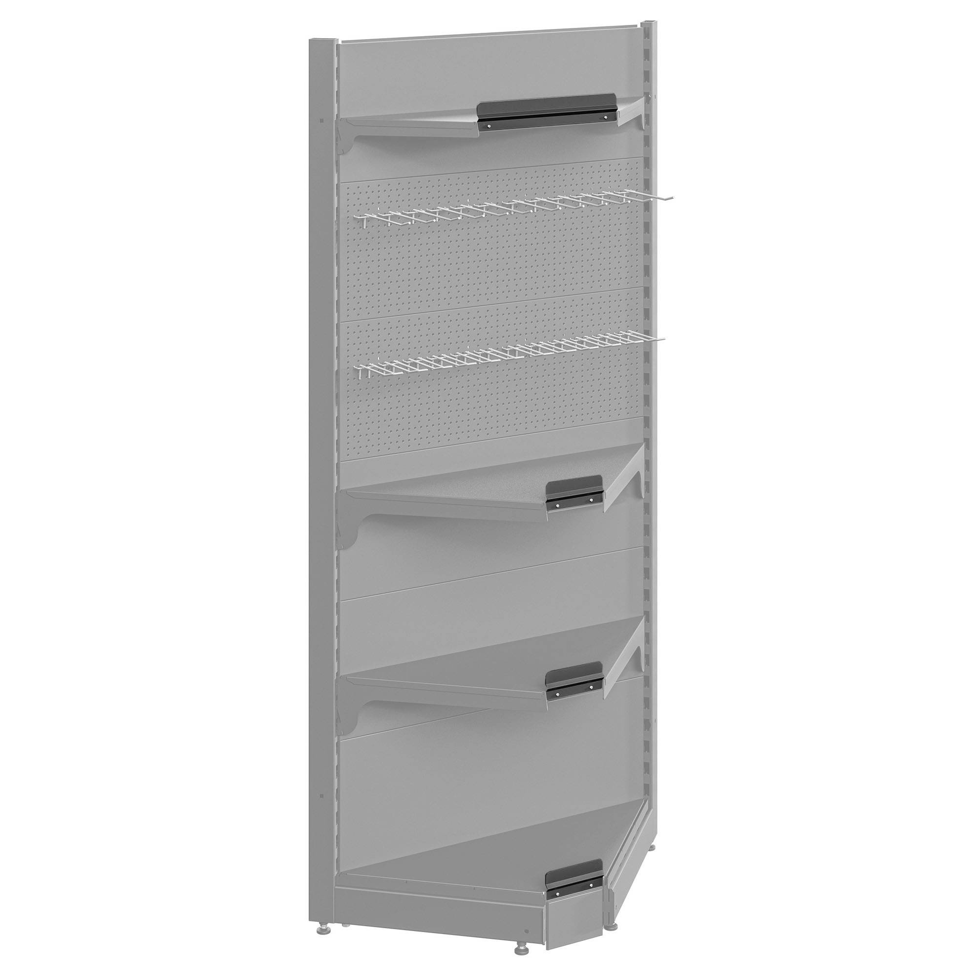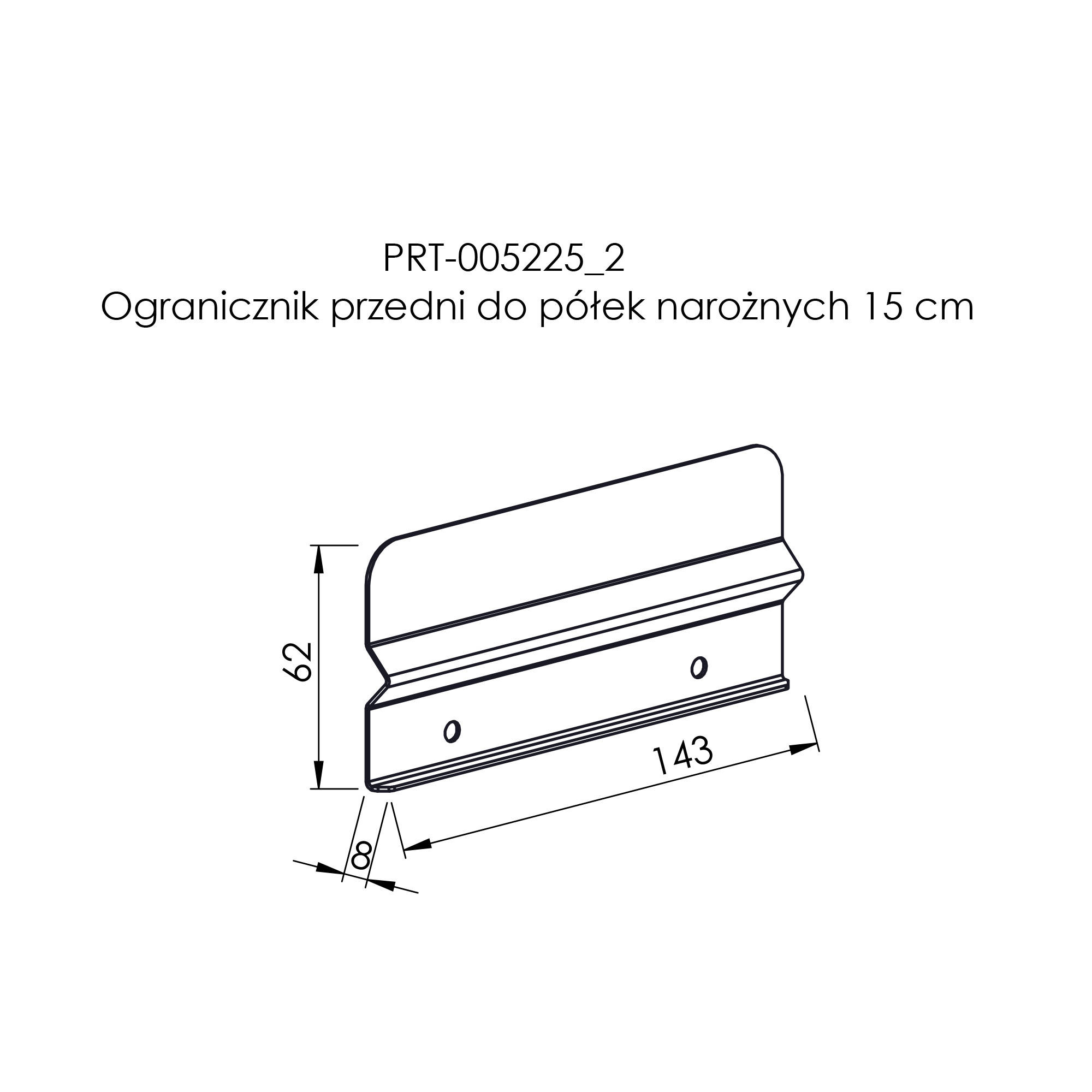 Metalowa banda o długości 15 cm dedykowana do montażu na frontach półek narożnych. Zapobiega zsuwaniu się asortymentu z blatu półkowego, umożliwia zaczepienie "cenówek" oraz maskuje łączenia konstrukcji, poprawiając wizualne walory całego regału.