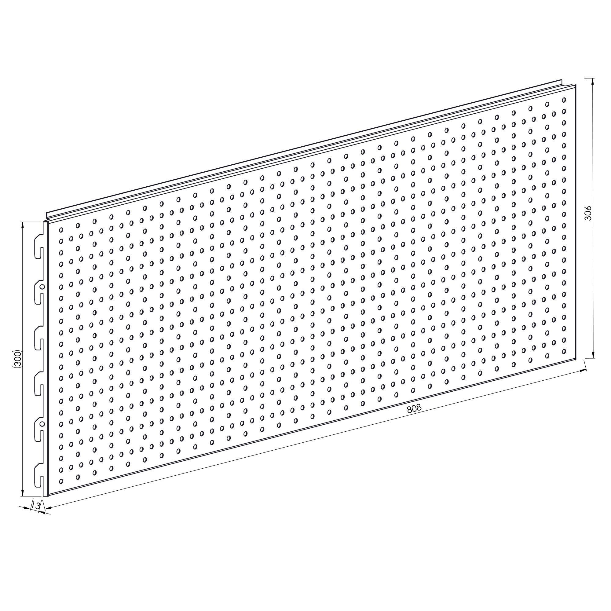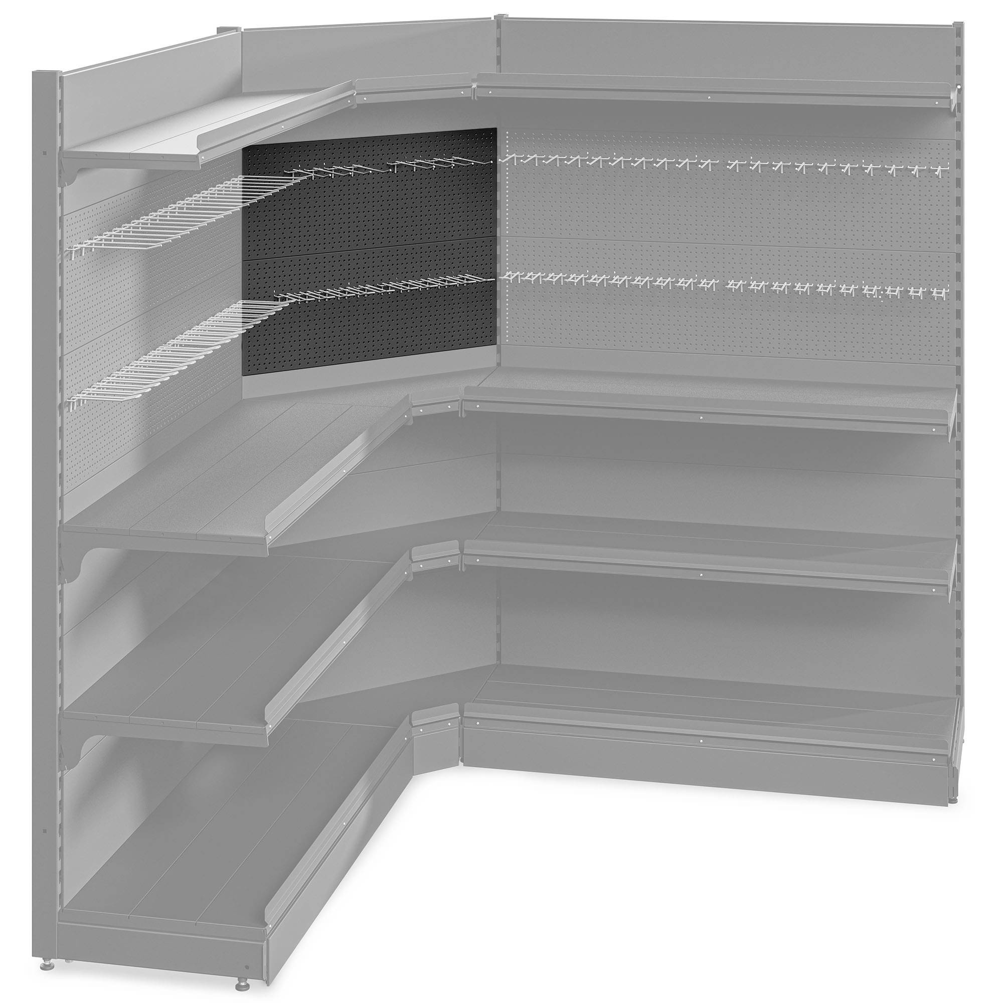 Metalowy element o długości precyzyjnej 80 cm stanowiący plecy regału narożnego. Na powierzchni blachy zostały wycięte otwory europerforacji umożliwiające montaż dodatkowych akcesoriów zgodnych z tym standardem np. Wieszaków ekspozycyjnych.