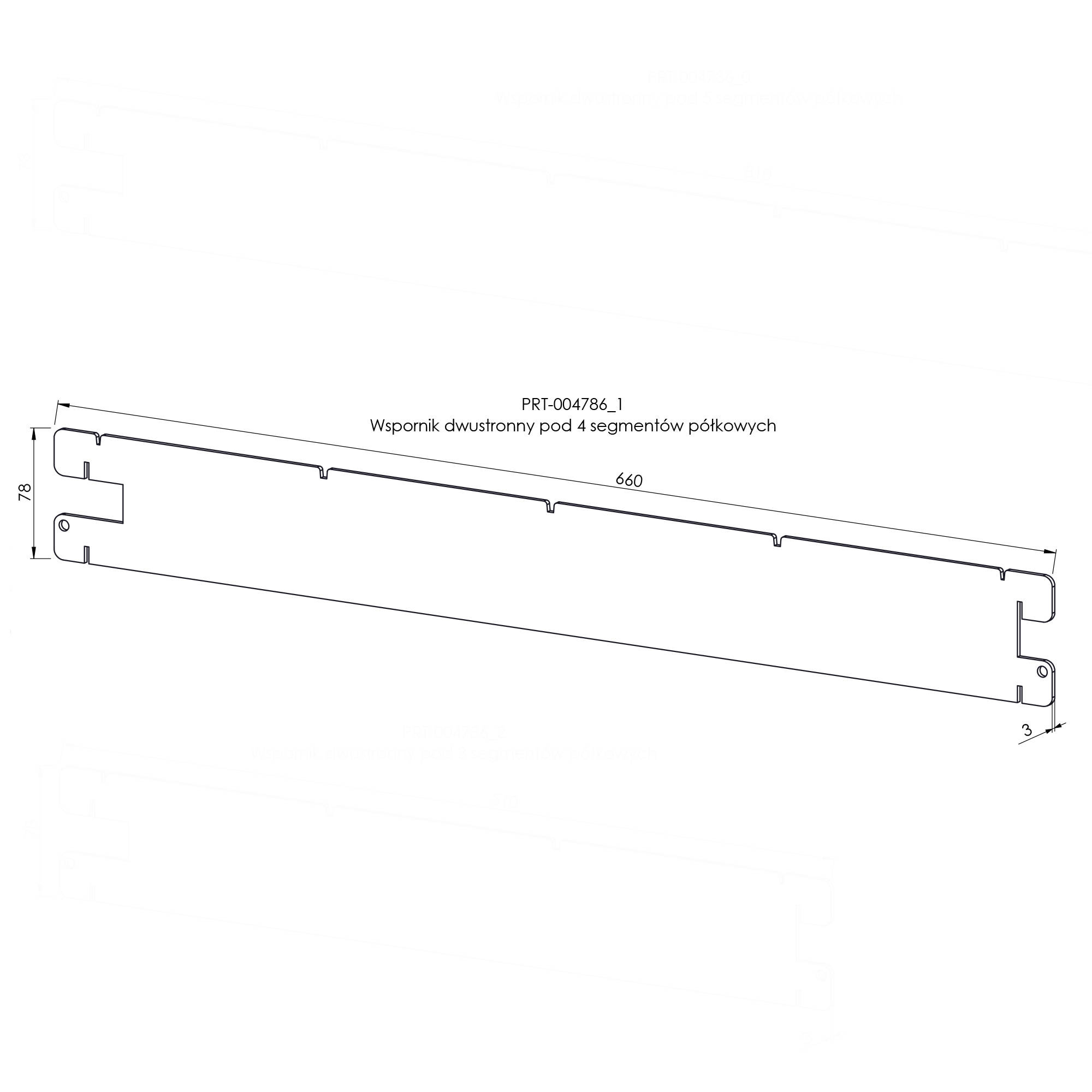 Wspornik do segmentów półkowych o długości 66 cm, obustronnie zakończony zaczepami montażowymi. Umożliwia połączenie dwóch słupów pionowych i utworzenie pomiędzy nimi półki składającej się z 4 segmentów. Podczas montażu zaczepy wsporników należy wsunąć w dopasowane do nich perforacje na słupach, a ranty segmentów półkowych umiejscowić w dedykowanych nacięciach na krawędziach wspornika.