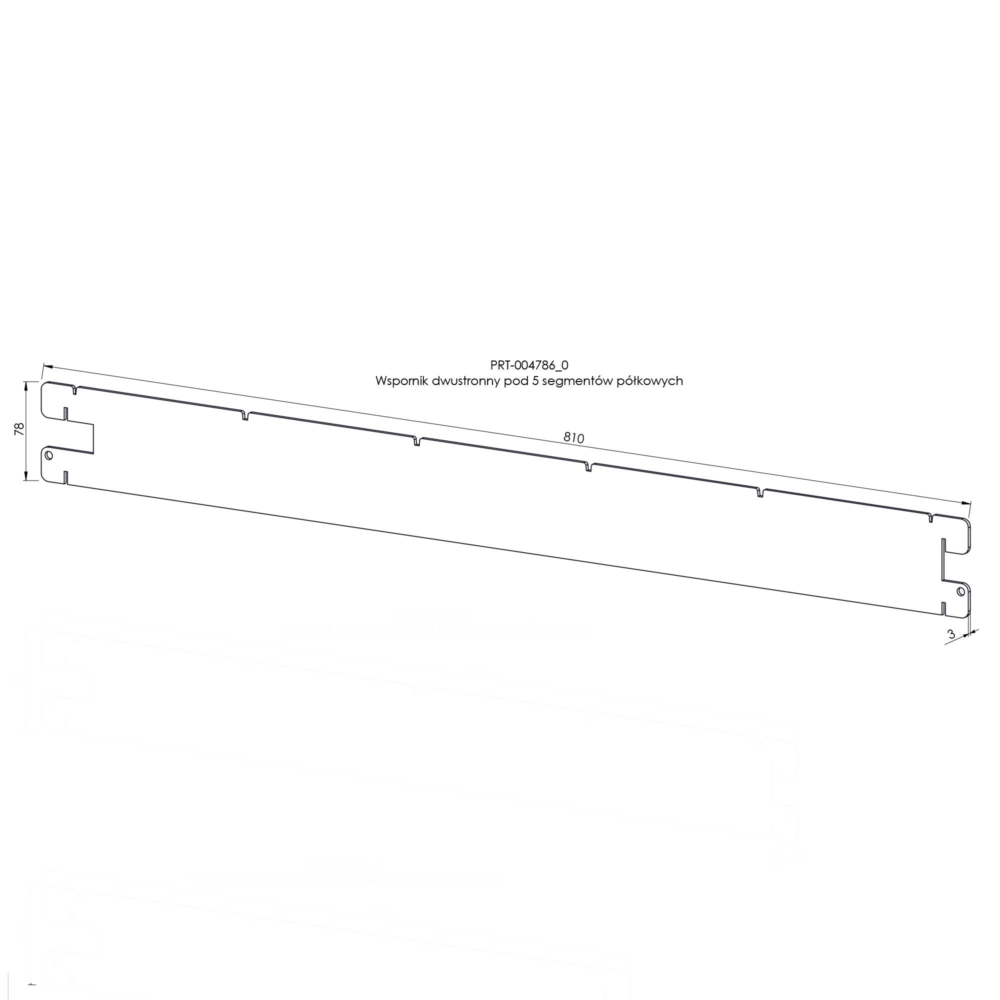 Wspornik do segmentów półkowych o długości 81 cm, obustronnie zakończony zaczepami montażowymi. Umożliwia połączenie dwóch słupów pionowych i utworzenie pomiędzy nimi półki składającej się z 5 segmentów. Podczas montażu zaczepy wsporników należy wsunąć w dopasowane do nich perforacje na słupach, a ranty segmentów półkowych umiejscowić w dedykowanych nacięciach na krawędziach wspornika.