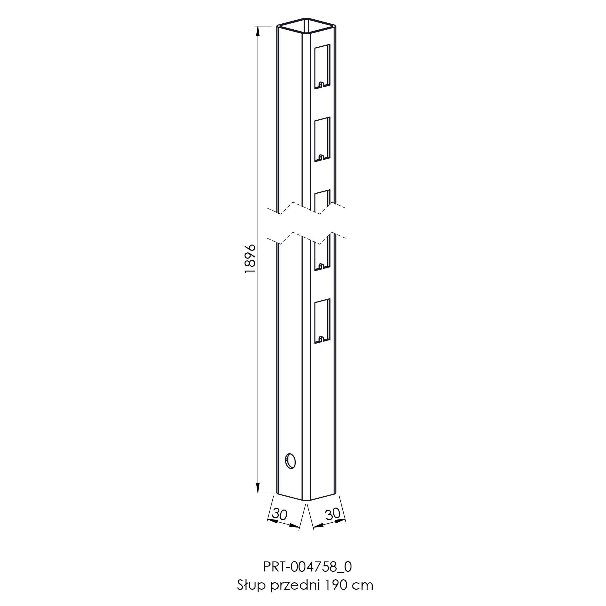 Pionowy słup o długości 190 cm stosowany jako wzmocnienie frontowej strony regału. Jego użycie determinuje wykorzystanie dwustronnych wsporników półek - jedno z zakończeń wspornika powinno zostać wsunięte właśnie wewnątrz perforacji słupa przedniego. Caly słup przedni powinien zostać osadzony na dedykowanym adapterze, który wraz ze słupem tworzy dodatkową stopę podpierającą całą konstrukcję regału.