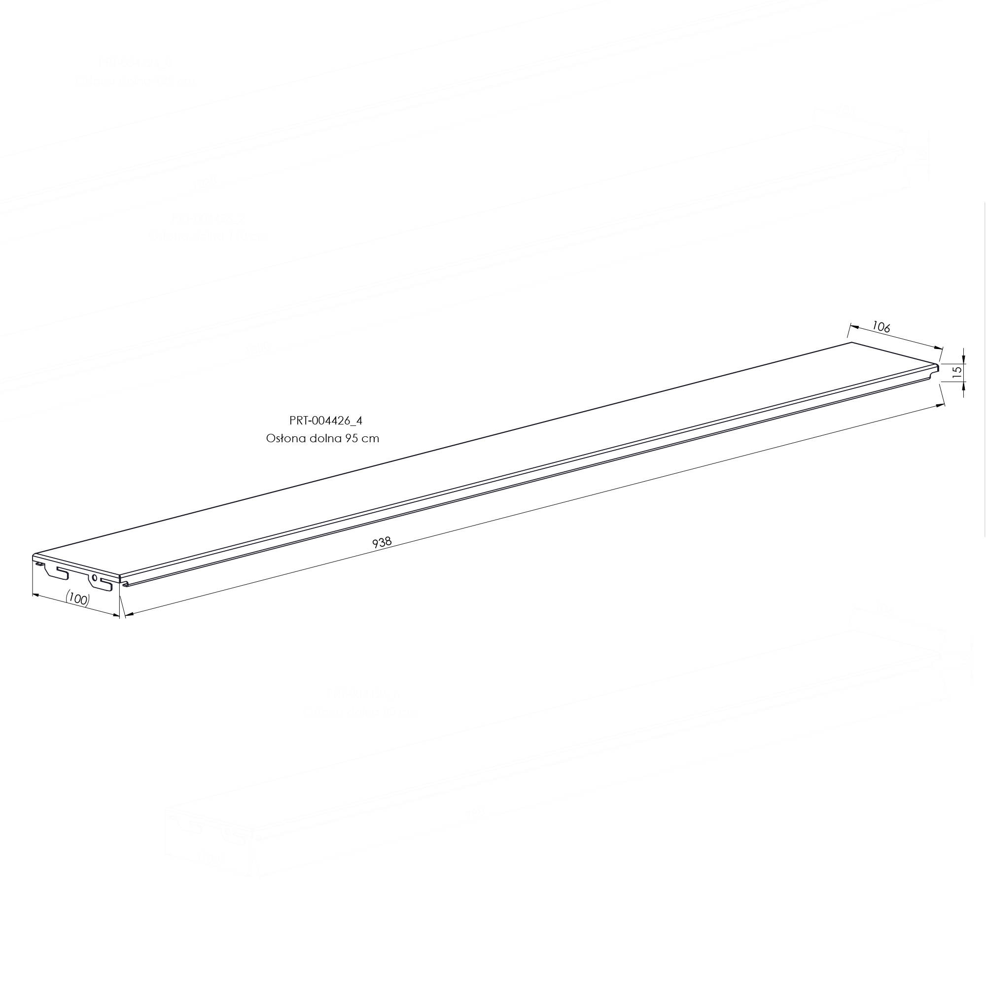 Metalowa maskownica o długości 95 cm montowana u podstawy konstrukcji regału, łącząca dwie stopy. Poprawia stabilność regału, ukrywa miejsca łączenia oraz zapobiega gromadzeniu się kurzu w trudnodostępnych zakamarkach konstrukcji.